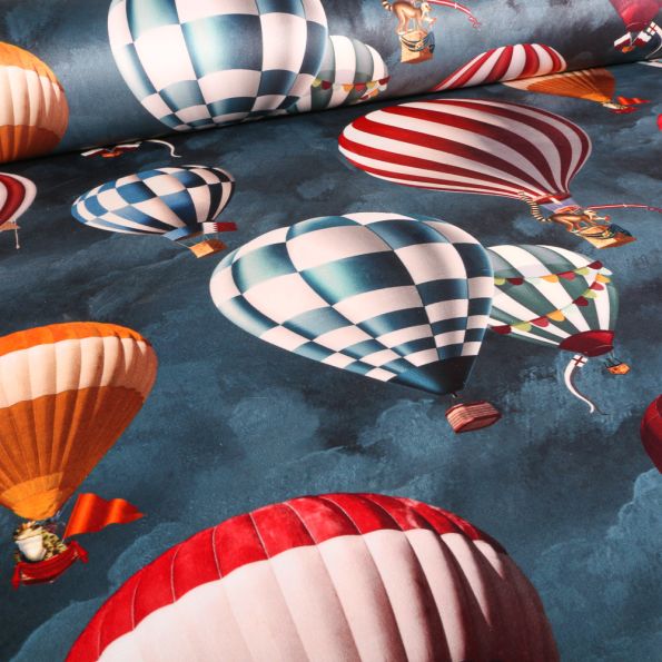 Tissu Velours ras épais tout doux Montgolfières sur fond Bleu nuit - Par 10 cm