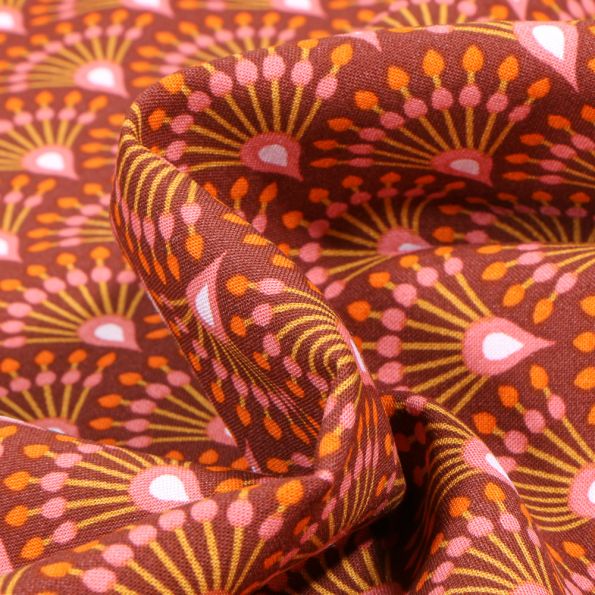 Tissu Viscose Arty Plumes de paon sur fond Rouille - Par 10 cm