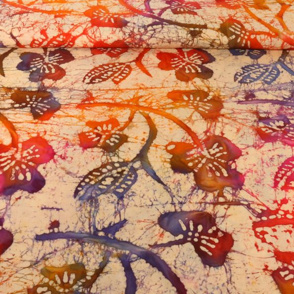 Tissu Viscose Batik Motifs floraux éclatants sur fond Beige - Par 10 cm