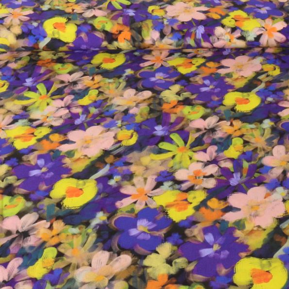 Tissu Viscose Digital imprimé Fleurs aquarelles sur fond Noir - Par 10 cm