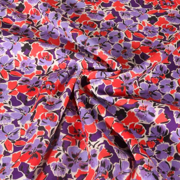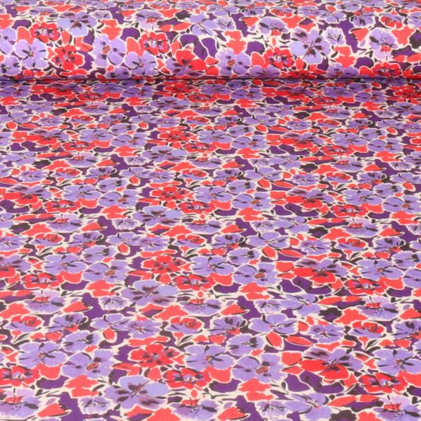 Tissu Viscose extensible Digital Fleurs parme et rouges sur fond Violet - Par 10 cm