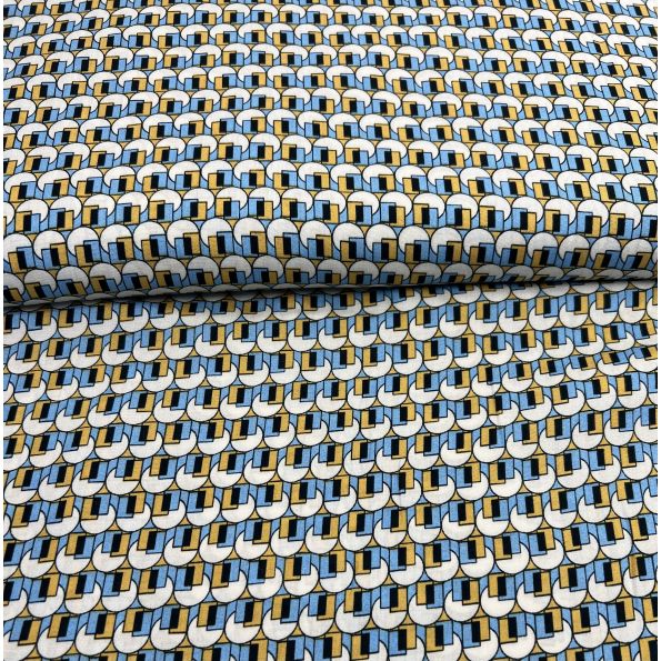 Tissu Viscose Formes Géo sur fond Bleu ciel - Par 10 cm