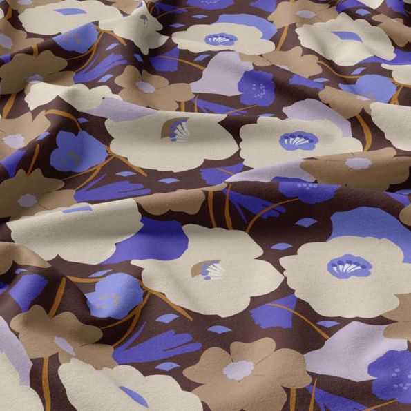 Tissu Viscose imprimé Georgina fleuris sur fond Marron chocolat - Par 10 cm
