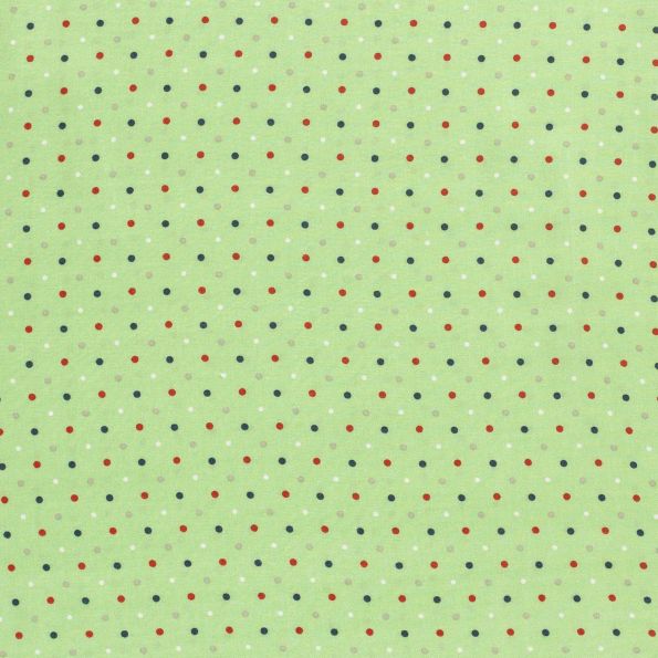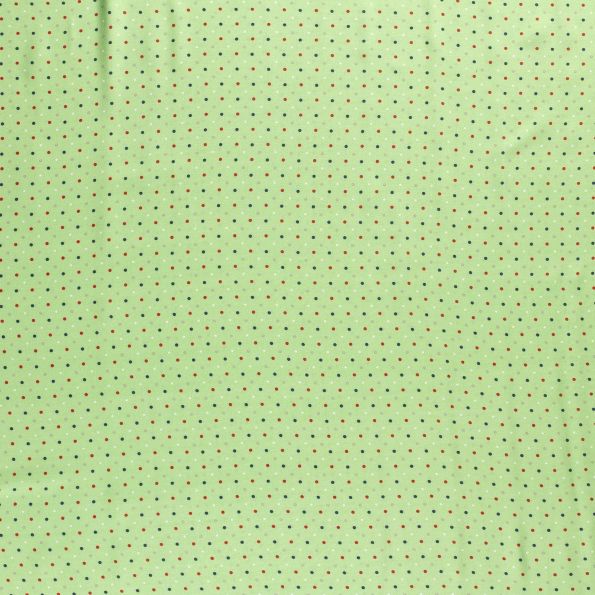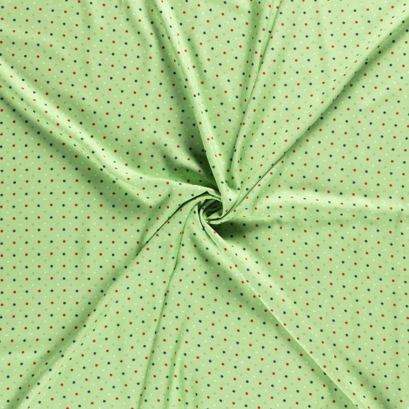 Tissu Viscose imprimé pois gris, rouges, blancs et bleu marine sur fond Vert pomme - Par 10 cm
