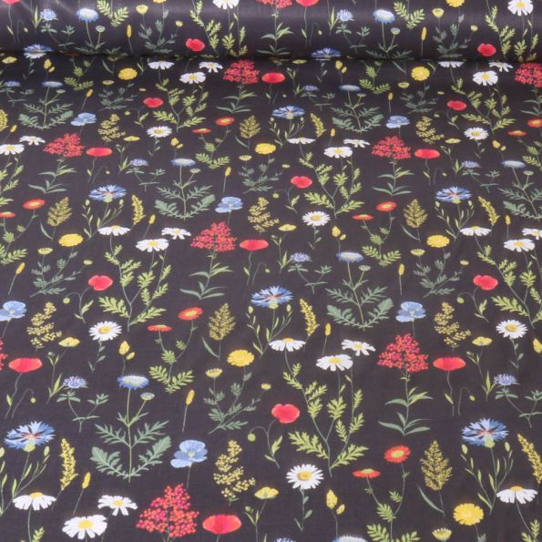 Tissu Viscose Sanfor Bleuet multico sur fond Noir - Par 10 cm