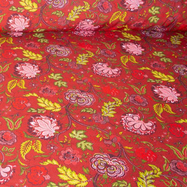 Tissu Viscose Sanfor Jodhpur floral sur fond Rouge - Par 10 cm