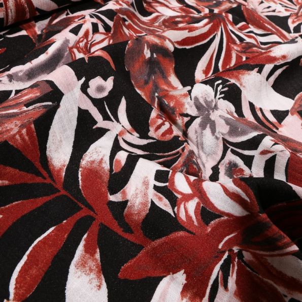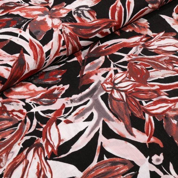 Tissu Viscose texturé Aquarelle de feuilles terracota sur fond Noir - Par 10 cm