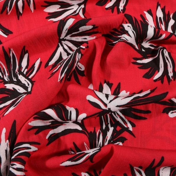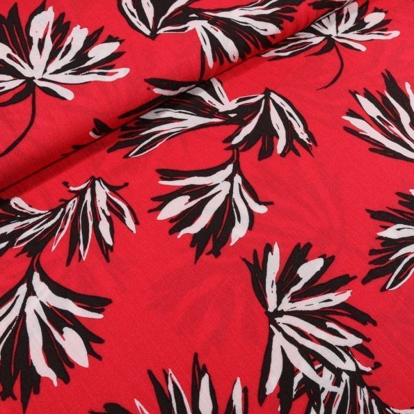 Tissu Viscose texturé Feuilles noires et blanches sur fond Rouge griotte - Par 10 cm