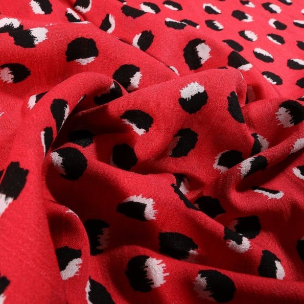 Tissu Viscose texturé Pois déstructuré noir et blanc sur fond Rouge griotte - Par 10 cm