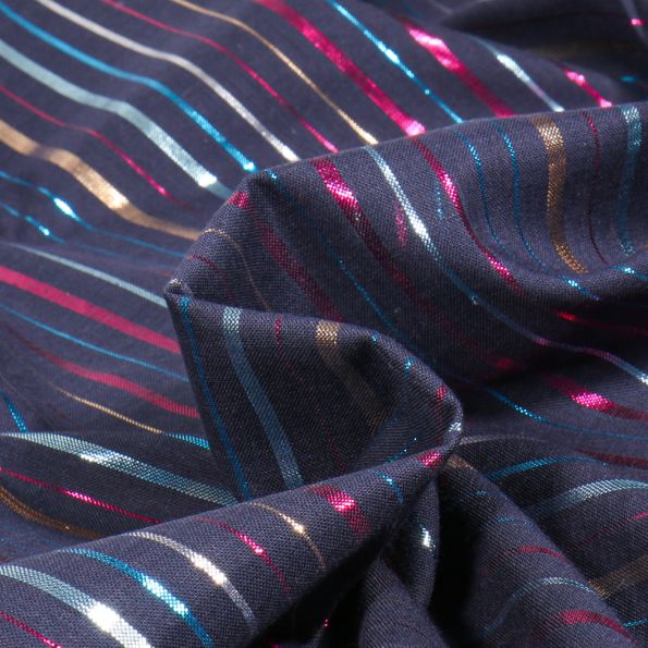 Tissu Voile de Coton Rayures métalissé multico sur fond Bleu marine - Par 10 cm