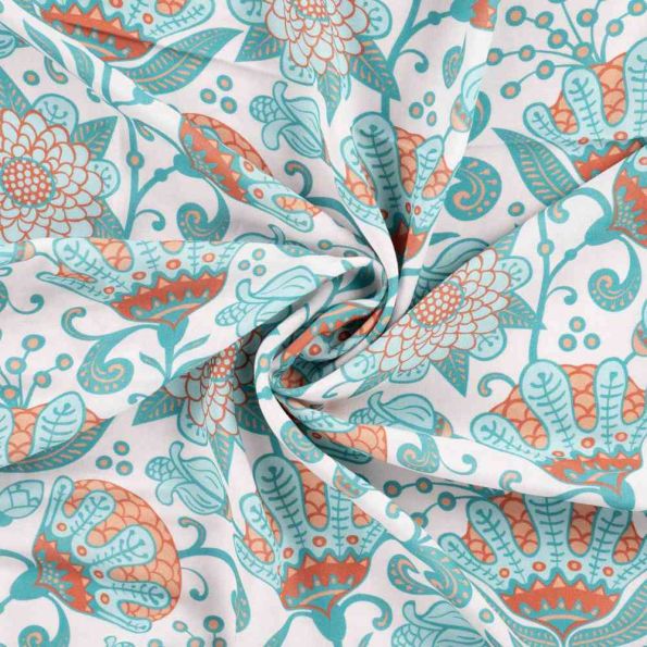 Léger comme une brise estivale, ce voile de viscose Ibiza séduit par son motif floral stylisé aux accents bohèmes, dans une belle harmonie de bleu turquoise, orange corail et blanc cassé. Ses fleurs aux formes arrondies et joyeuses évoquent un esprit libre et solaire, idéal pour la saison chaude. Composé à 100 % de viscose, ce tissu offre un tombé fluide, un toucher doux et une légèreté incomparable. Sa laize de 150 cm et son poids plume de 90 g/m² le rendent parfait pour la confection de vêtements vaporeux (robes longues, blouses, foulards, jupes fluides) mais aussi pour des accessoires estivaux pleins de fraîcheur. Facile à entretenir (lavage en machine à 30°), ce voile est idéal pour toutes vos envies créatives sous le signe de l’évasion.