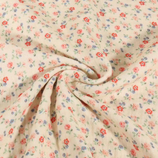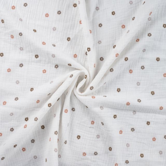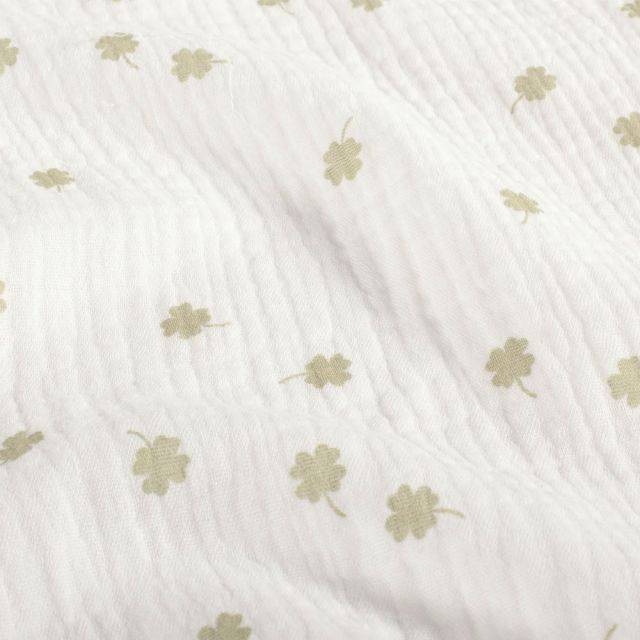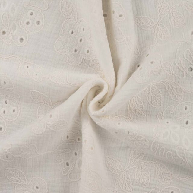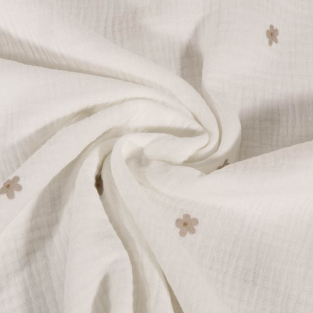 Le tissu double gaze est constitué de deux épaisseurs de gaze de coton cousues ensemble par des petits points très discrets, quasiment indétectables. C’est un tissu assez léger et souple grâce à une trame plutôt lâche. Contrairement à ce qu’on pourrait croire, le tissu double gaze n’est pas transparent contrairement à la simple gaze de coton, puisque doublé. C’est un tissu à la mode en ce moment, idéal en été par sa légèreté. Le tissu double gaze est également très absorbant, ce qui le rend idéal dans la confection de linge pour bébé.