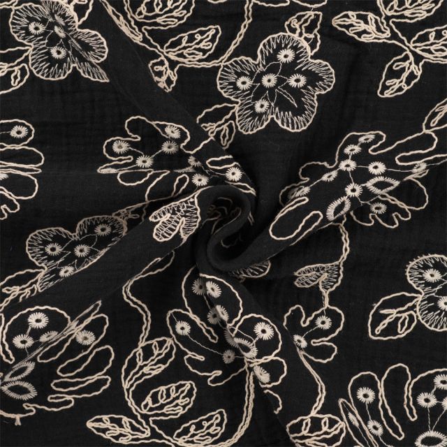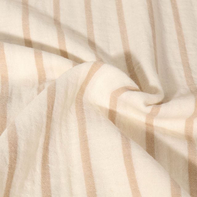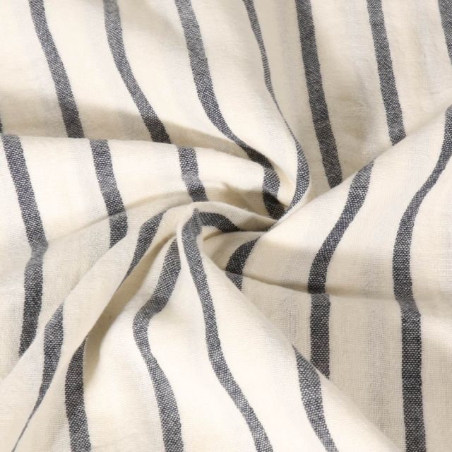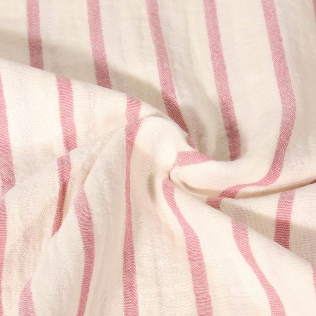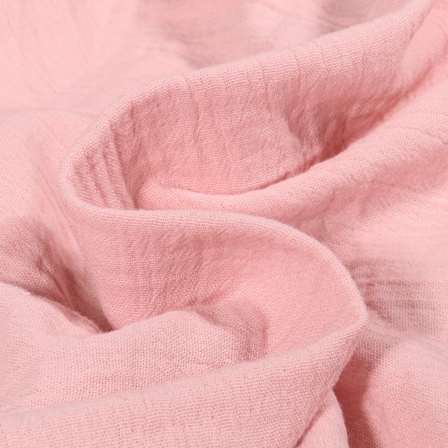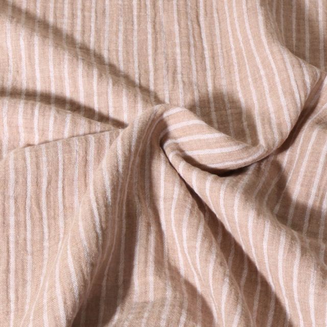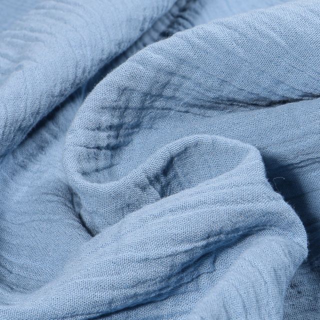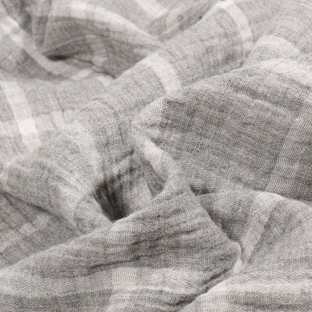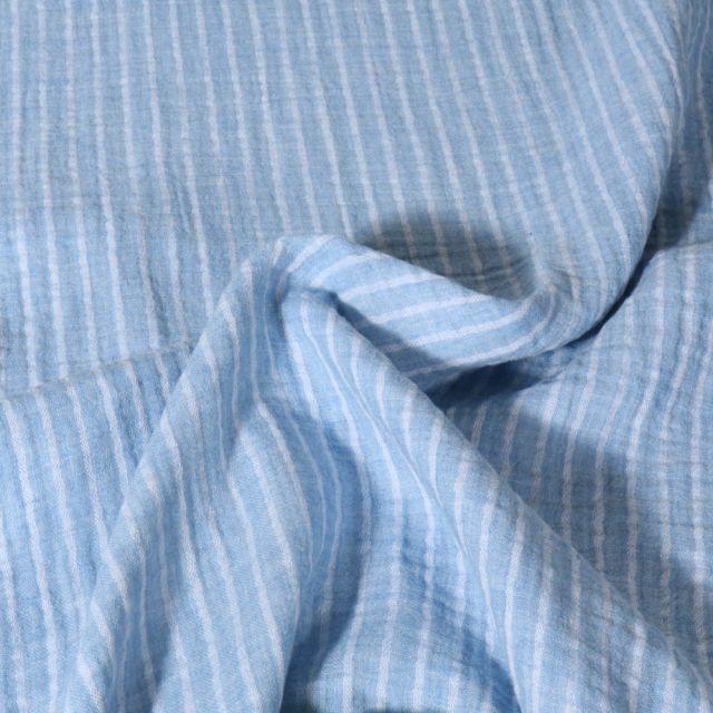 Le tissu double gaze est constitué de deux épaisseurs de gaze de coton cousues ensemble par des petits points très discrets, quasiment indétectables. C’est un tissu assez léger et souple grâce à une trame plutôt lâche. Contrairement à ce qu’on pourrait croire, le tissu double gaze n’est pas transparent contrairement à la simple gaze de coton, puisque doublé. C’est un tissu à la mode en ce moment, idéal en été par sa légèreté. Le tissu double gaze est également très absorbant, ce qui le rend idéal dans la confection de linge pour bébé.